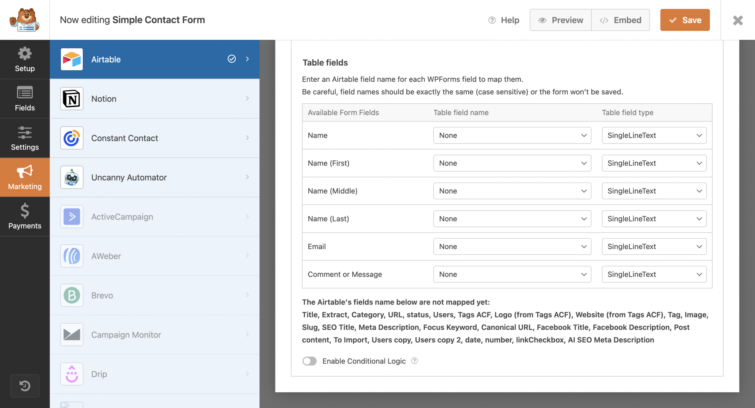In the next step, you’ll match the different fields between your Airtable table and your WPForms form, and you’ll be done.