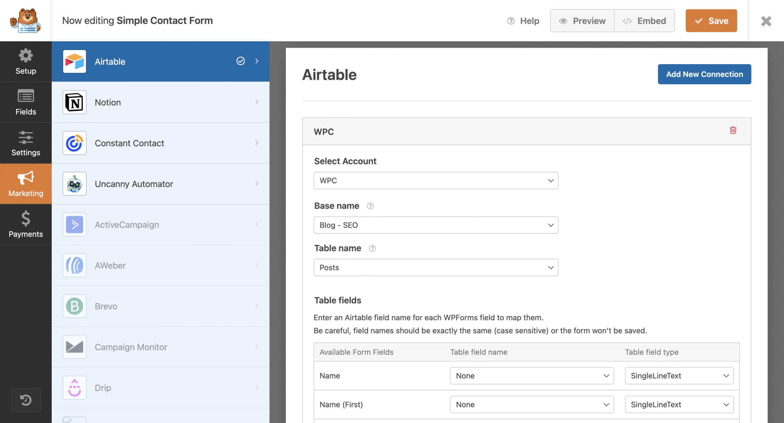 Once the connection with your Airtable table is established, you need to map the fields from your WPForms form to the corresponding fields in the Airtable table. This will transfer the data entered into the form to the correct fields in your Airtable database and in the correct formats.